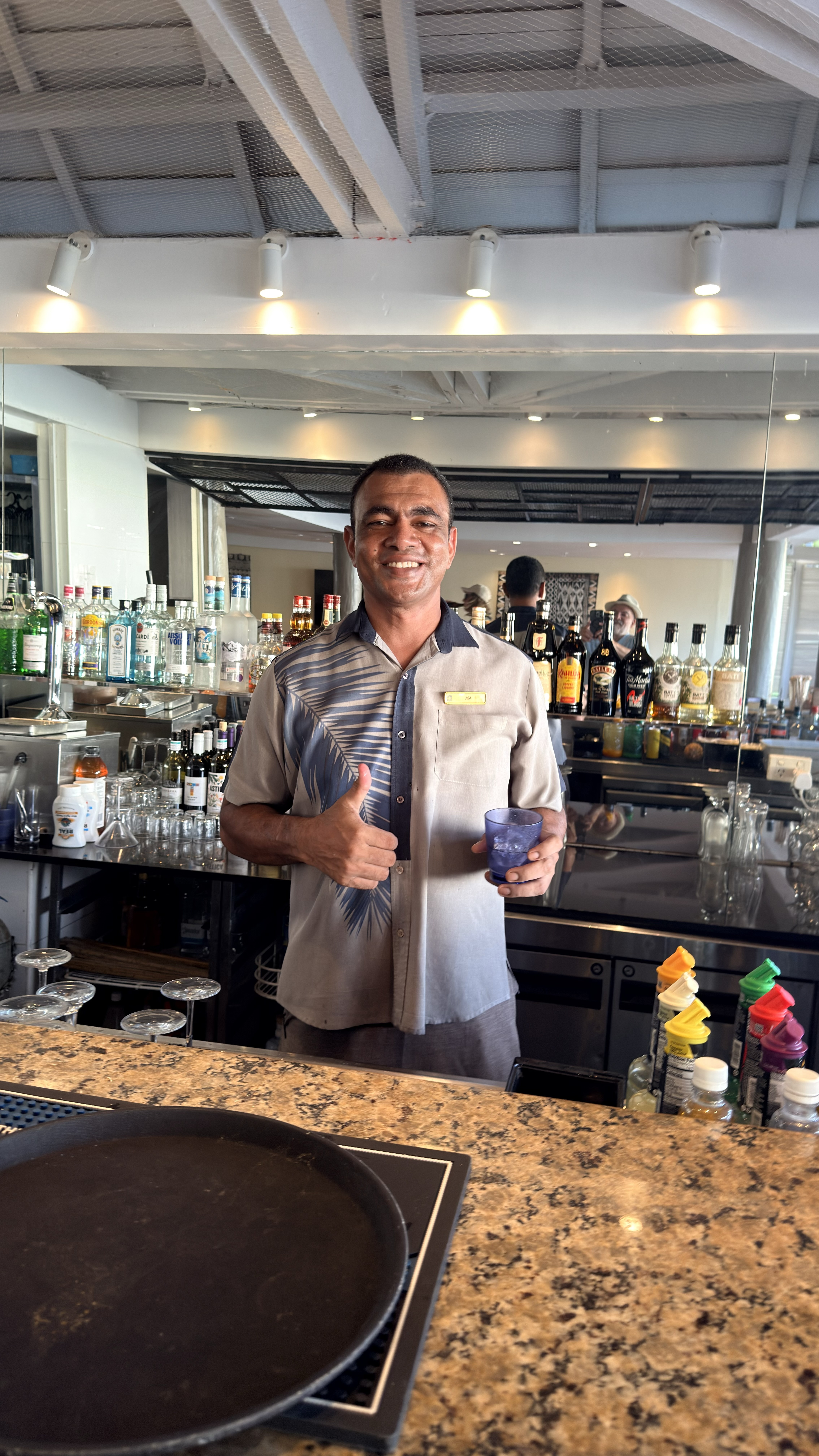 My Exclusive Reef Bar barman the wonderful Asa forces free happy hour cocktails at me willy and some would add nilly. One day we’d been talking about Gin so it was then Fijian Gin cocktails (Blue Turtle gin for scholars out there) look out for it. His “Gin Fruit Cocktail” and Strawberry Daiquiri were especially gorgeous!